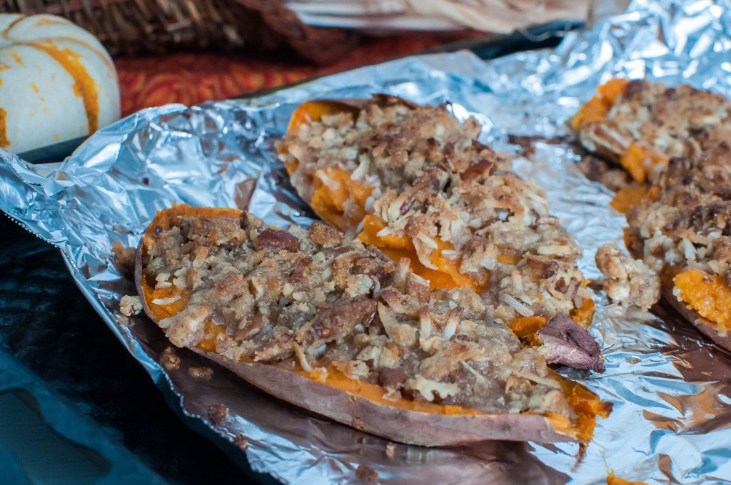 Although I did go with the sweet route, I decided to do something a little different and skipped the marshmallows and went straight for a coconut pecan streusel. Because I will never turn down anything topped with streusel and anyone that would isn’t a friend of mine. Just kidding, we can still be friends…I’ll just think you’re a tad crazy. But who isn’t, right?