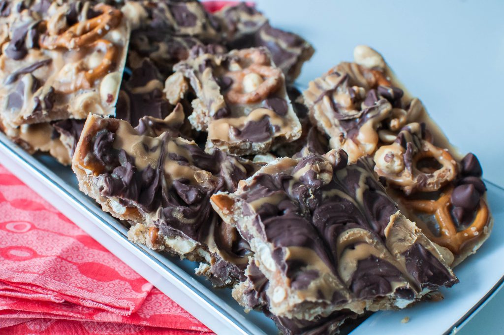 This bark is a play off the ever popular salted caramel pretzel bark that everyone loves so much. I took away the flaky sea salt and made a peanut butter caramel sauce as well as drizzled melted peanut butter on top for a gorgeous marbled effect. Isn’t it pretty?