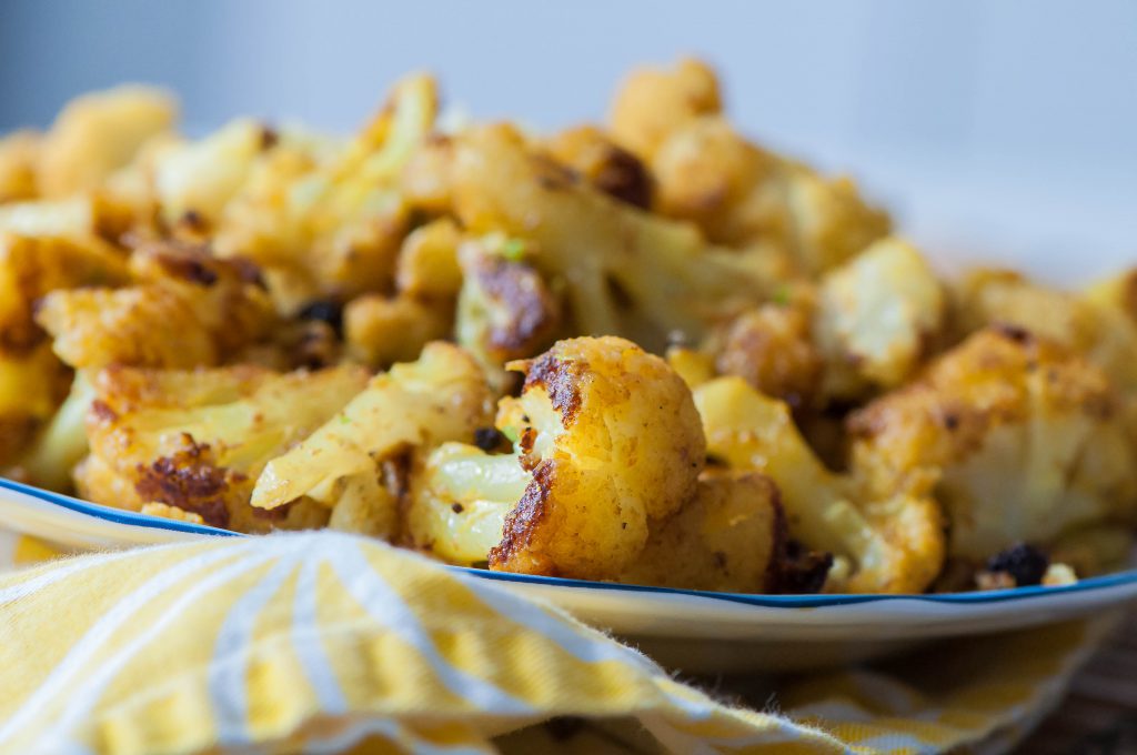 My favorite way to eat cauliflower is roasted. It gets brown and crispy in the oven which brings out its sweetness. I always simply toss it with olive oil, salt and pepper but while I was looking for some interesting Indian recipes to try, I came across this spiced cauliflower that looked too good not to try.