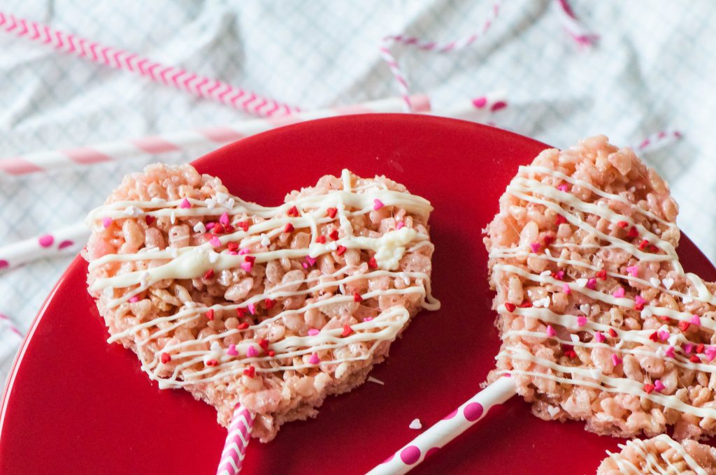 - Using a heart shaped cookie cutter, cut rice krispies. Cut paper straws in half and stick them into the cut rice krispies.
