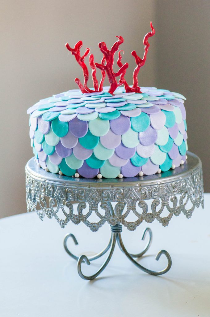 Hannah’s Mermaid Cake for her 3rd birthday party is my first attempt at a decorated layer cake. Decorated with purple and teal fondant mermaid scales, pearl dust, pearl candies and hand piped coral, this key lime pie cake turned out very successful.
