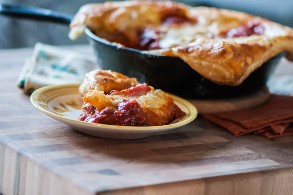 Lay it on top of the skillet of deliciously thick meat and randomly place the cutouts on top as well before brushing the whole crust with egg wash and let the shredded parmesan rain. Bake that sucker to golden, puffy perfection and you basically have an upside down pizza that won’t receive any complaints. Hopefully. I actually can’t make any promises on the issue of picky eaters.