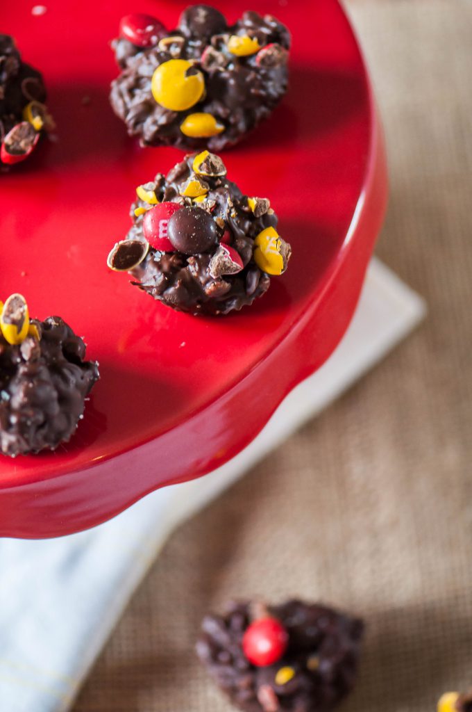 Semisweet chocolate chips, autumn colored M&M’s and rice krispies are what you need on hand to make these bad boys. Flaked sea salt is technically an optional ingredient but for me it’s totally necessary. I love a little salt with my sweet and it sets off the sweetness of all the chocolate so nicely here.