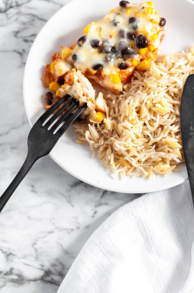Because the chicken bakes in the enchilada sauce it comes out super tender. The corn adds some pops of freshness and the black beans are rich and creamy. And of course that melted cheese.