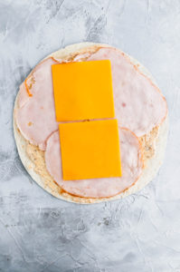 - Layer on the lettuce, tomato and bacon evenly across the middle of each tortilla.